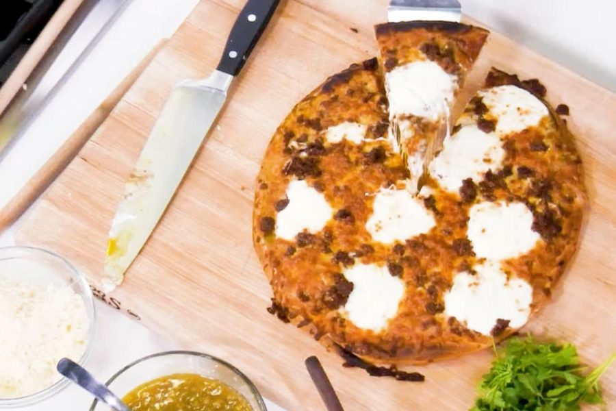 Chef Katsuji Tanabe’s Chorizo and Chihuahua® Cheese Pizza is topped with layers of refried beans, Pork Chorizo, and delicious melted Chihuahua® Cheese.