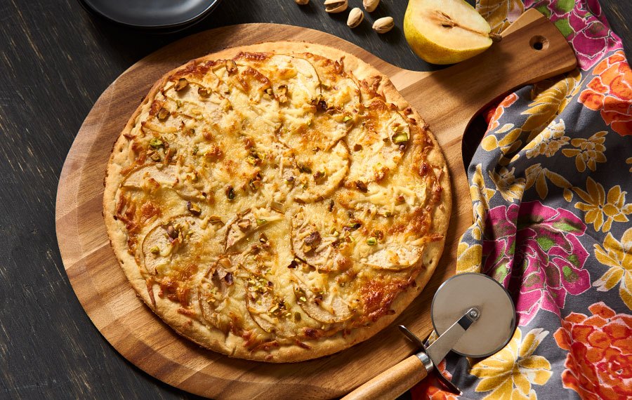 ¿Te gustan los sabores dulces y salados? Prepara esta deliciosa Pizza con pera, pistachos y una salsa de guayaba acompañada con Queso Chihuahua®. Una combinación deliciosa.